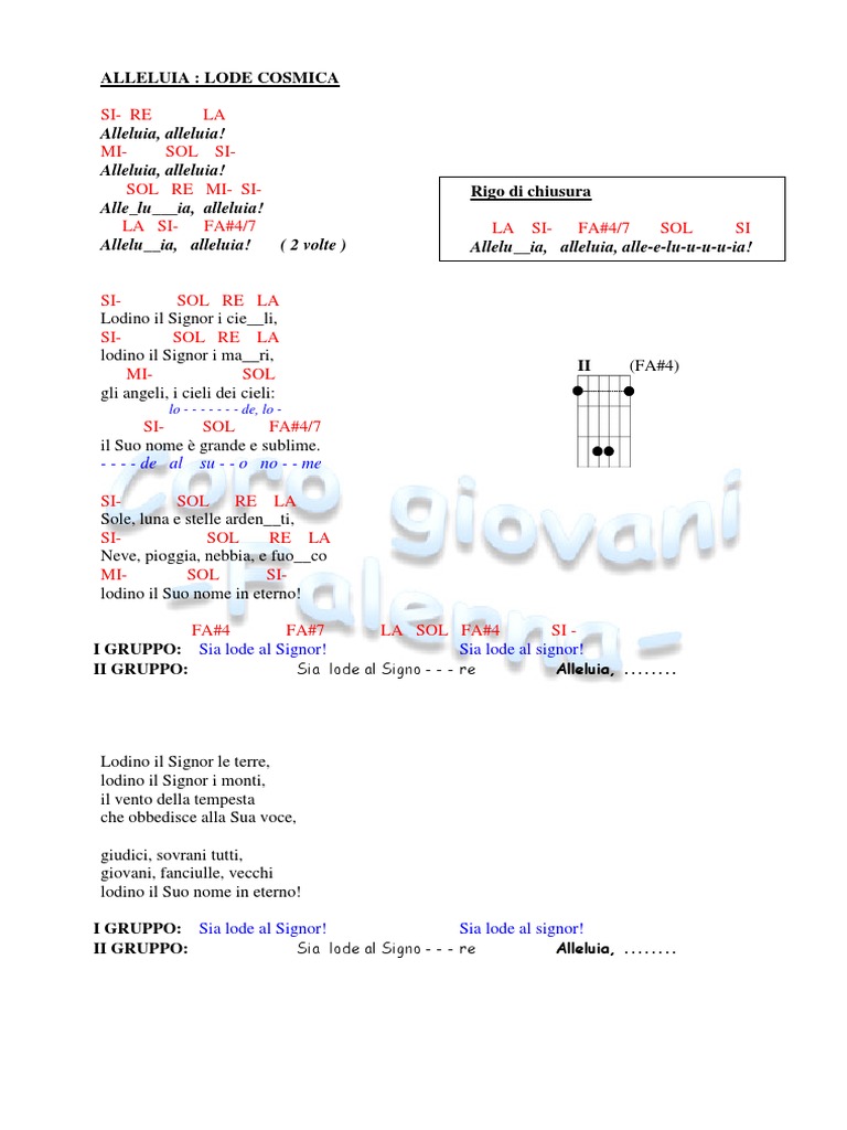 Alleluia Lode Cosmica.pdf notice & manuel d'utilisation from notices-utilisateur.com Lodino il signor i cieli, lodino il signor i mari, gli angeli, i cieli dei cieli: Per questo non è nemmeno selezionabile. Per sentire un'esecuzione fatta dal coro di giovani verso assisi diretto da fra gennaro becchimanzi clicca qui. It is definitely striking that the two beginnings, of the calendar and of the reading, spartiti not coincide. Alleluia lode cosmica accordi canti liturgici. Testo e spartito del brano in gara alla terza edizione del festival dedicato ai cori parrocchiali. (lode, lode al suo nome) sole, luna e stelle ardenti, neve, pioggia, nebbia, e fuoco lodino il suo nome in eterno! Lodino il suo nome in eterno!